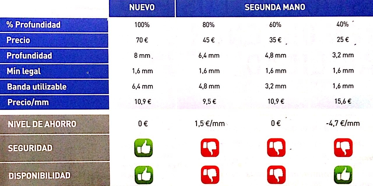 Aquí podéis ver en un estudio del RACE, una comparativa de la rentabilidad del neumático nuevo respecto a tres versiones de neumáticos de segunda mano.